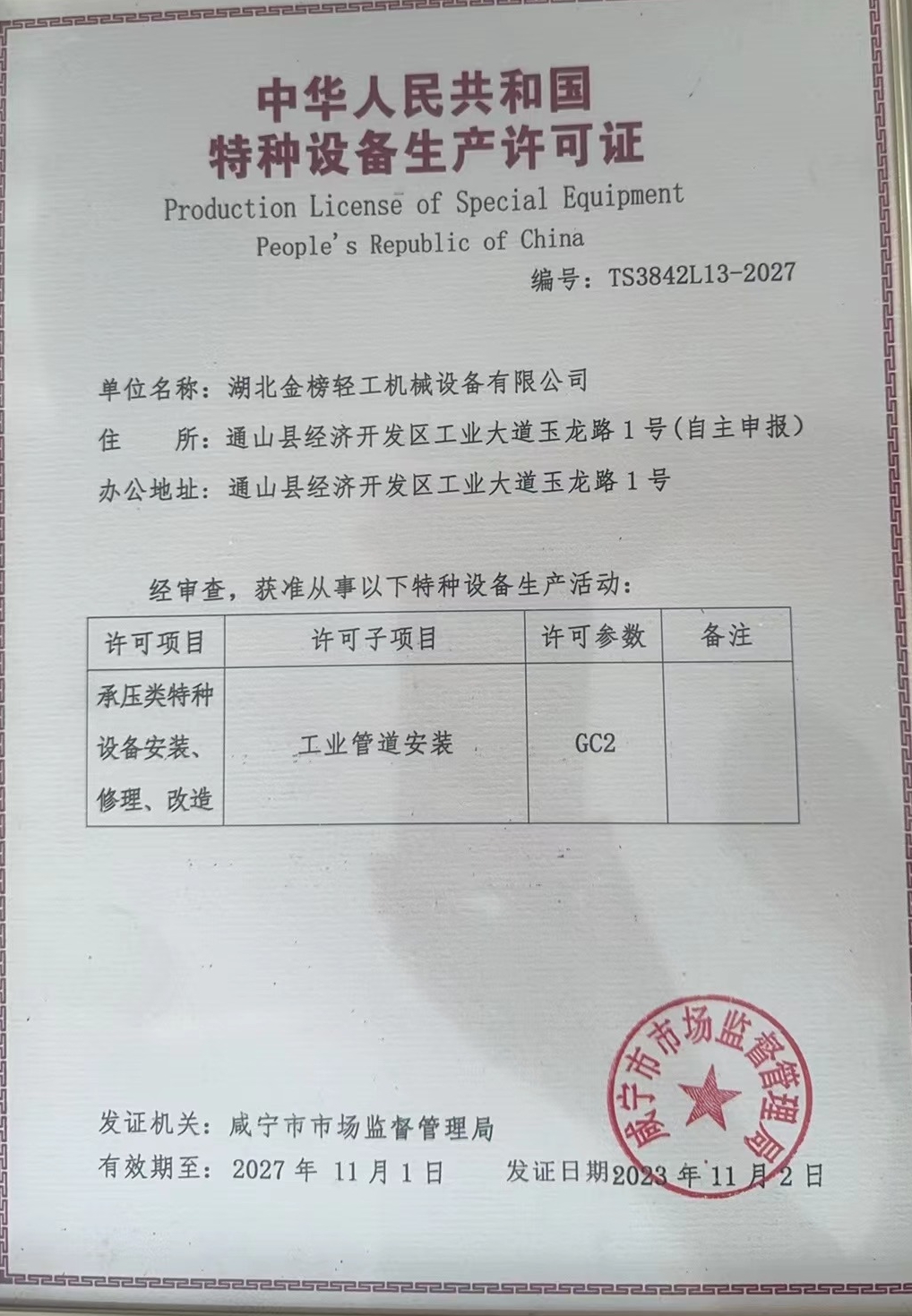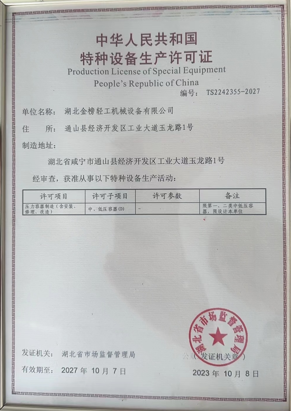 Special equipment production license of the People's Republic of China