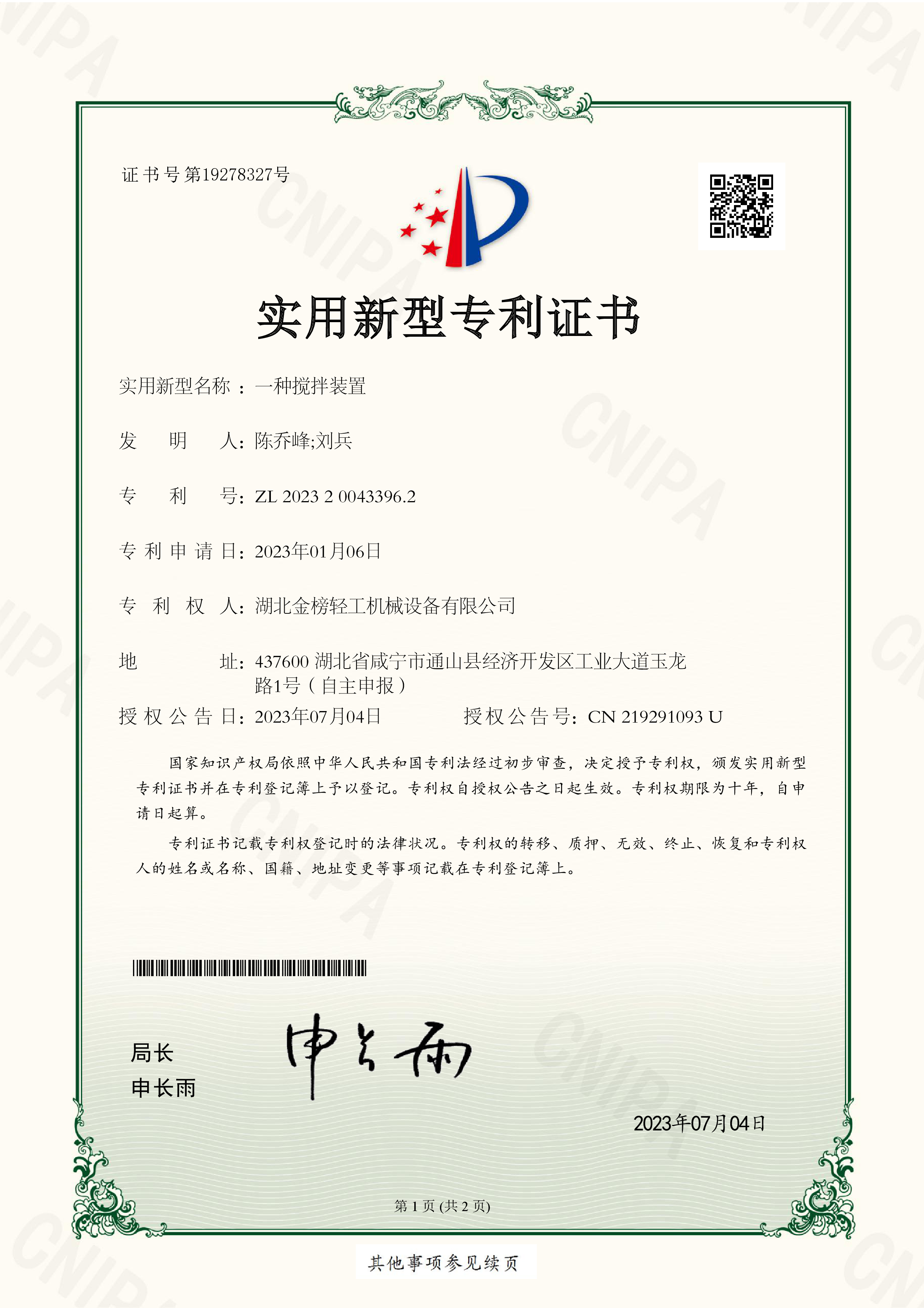 2023200433962-Utility model patent certificate